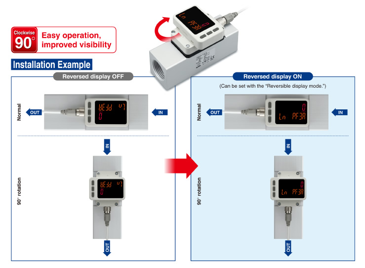 The display can be rotated in increments of 90° according to the installation. The display can be reversed for easy operation.