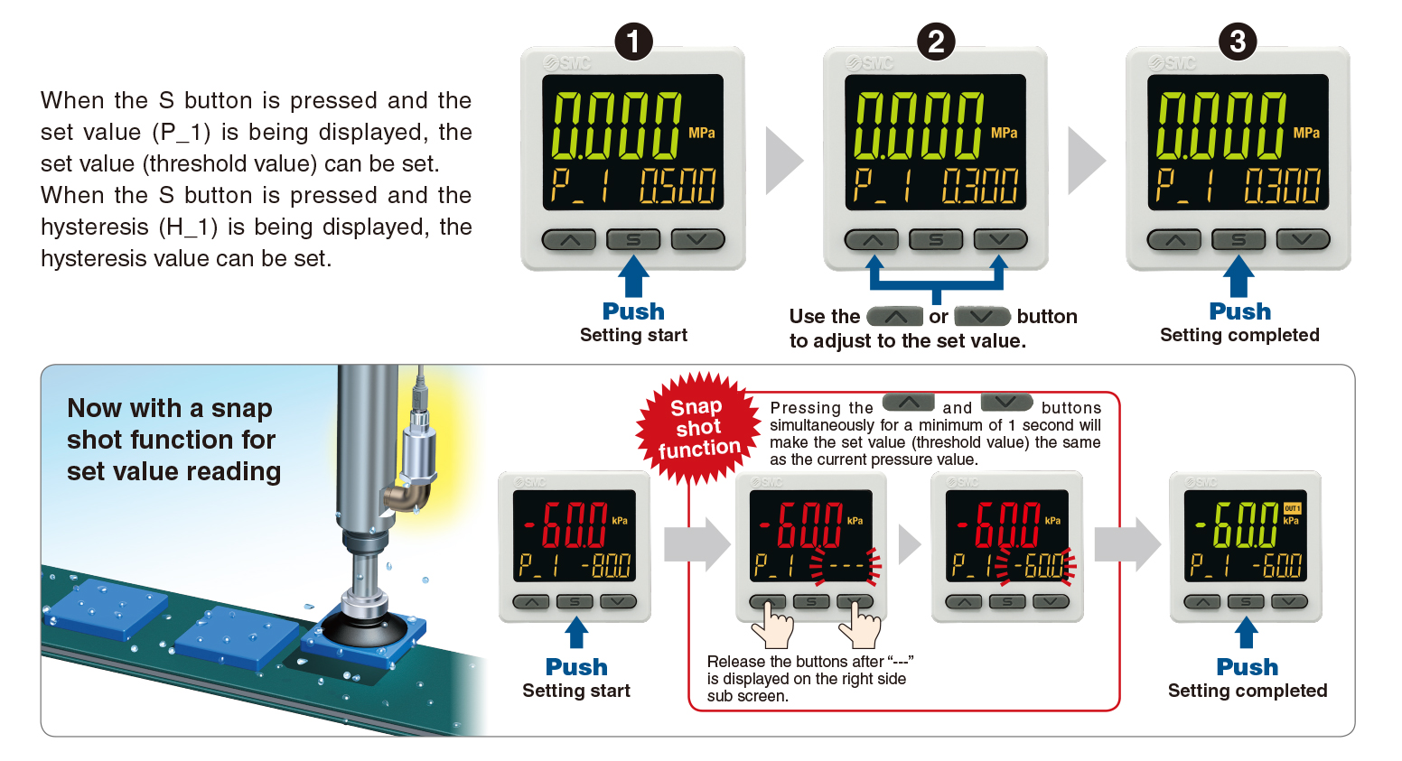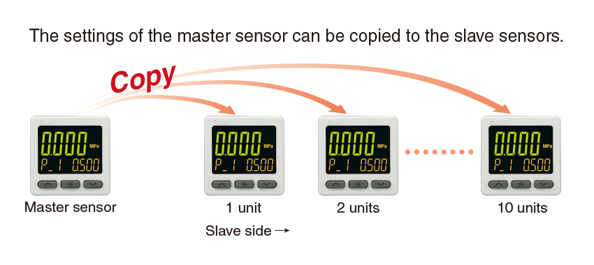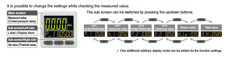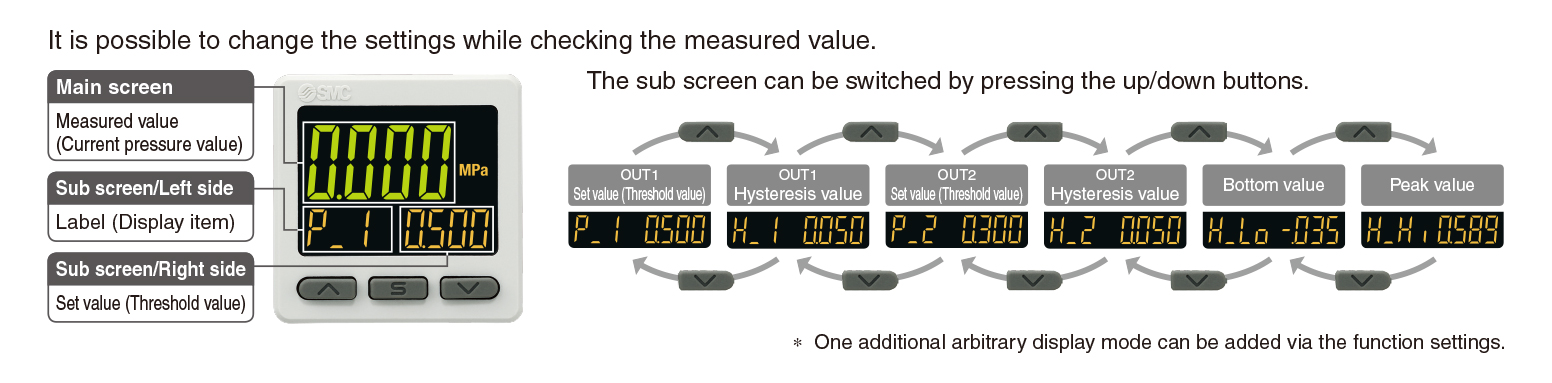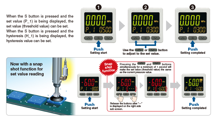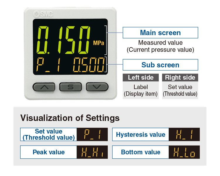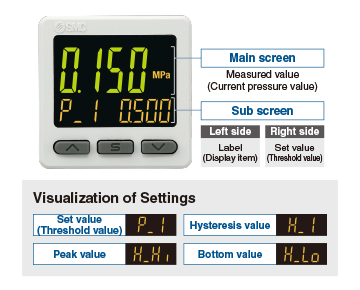 Applicable SMC pressure sensor: PSE53□, PSE54□, PSE550, PSE57□, PSE56□ ・It is possible to change the settings while checking the measured value. ・NPN/PNP Switch Function ・Input Range Selection (for Pressure/Flow rate) ・Simple 3-Step Setting |