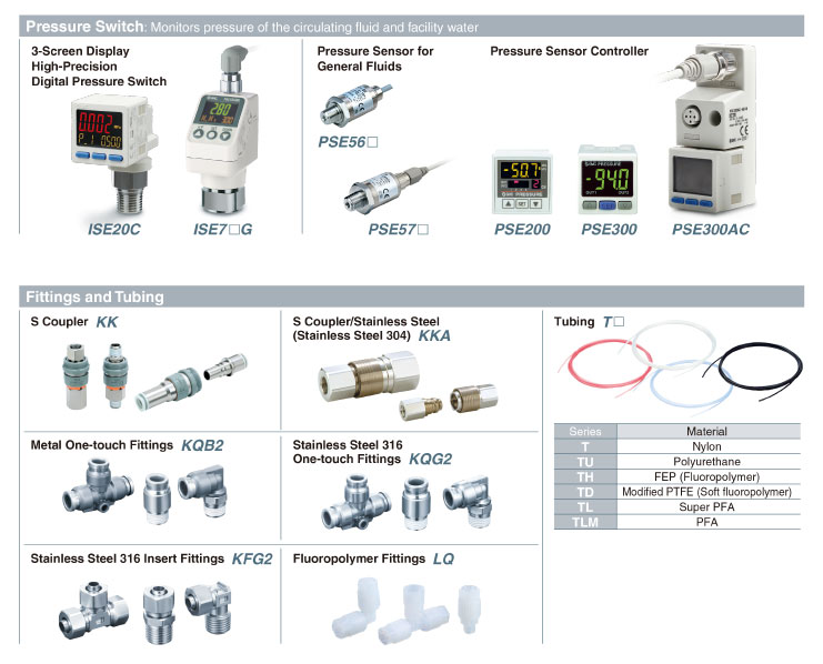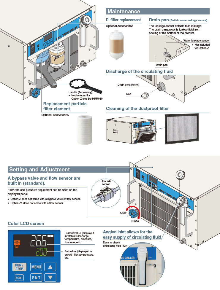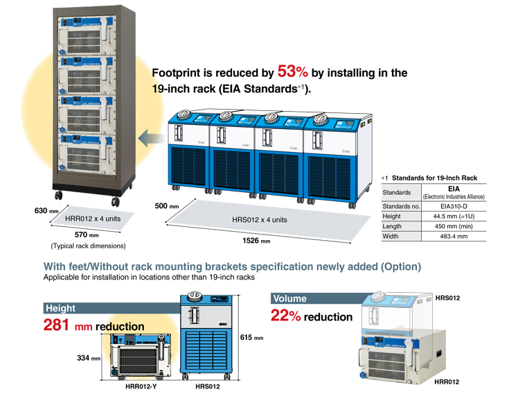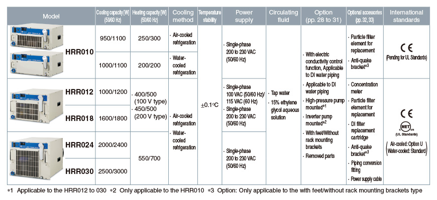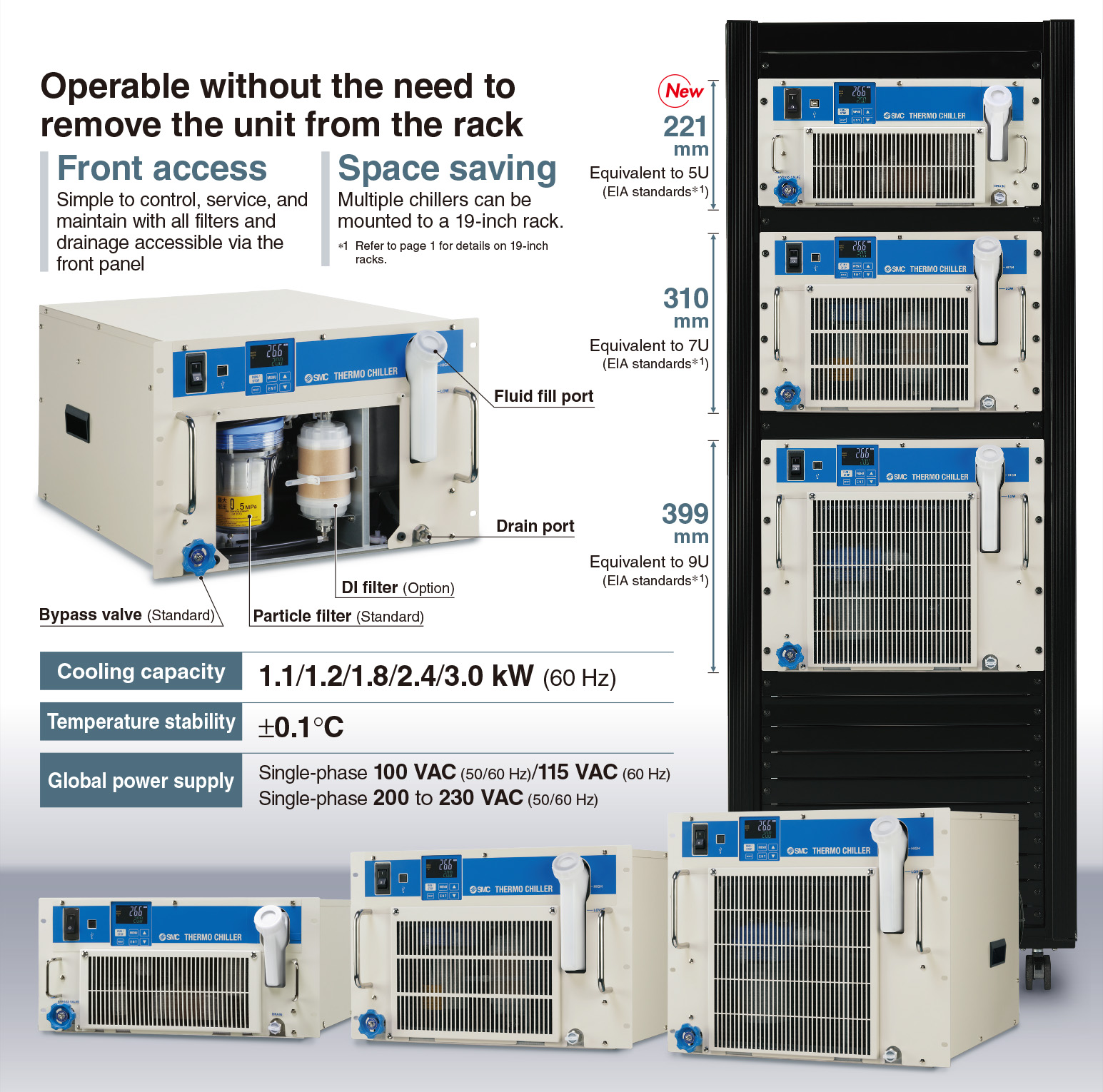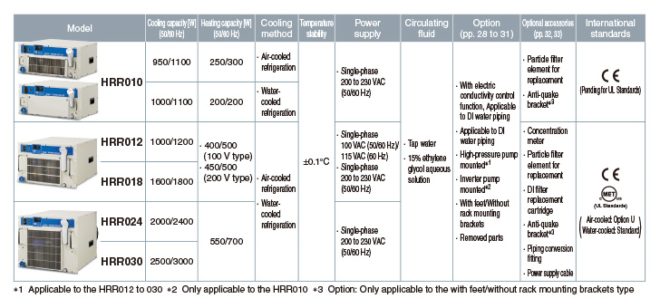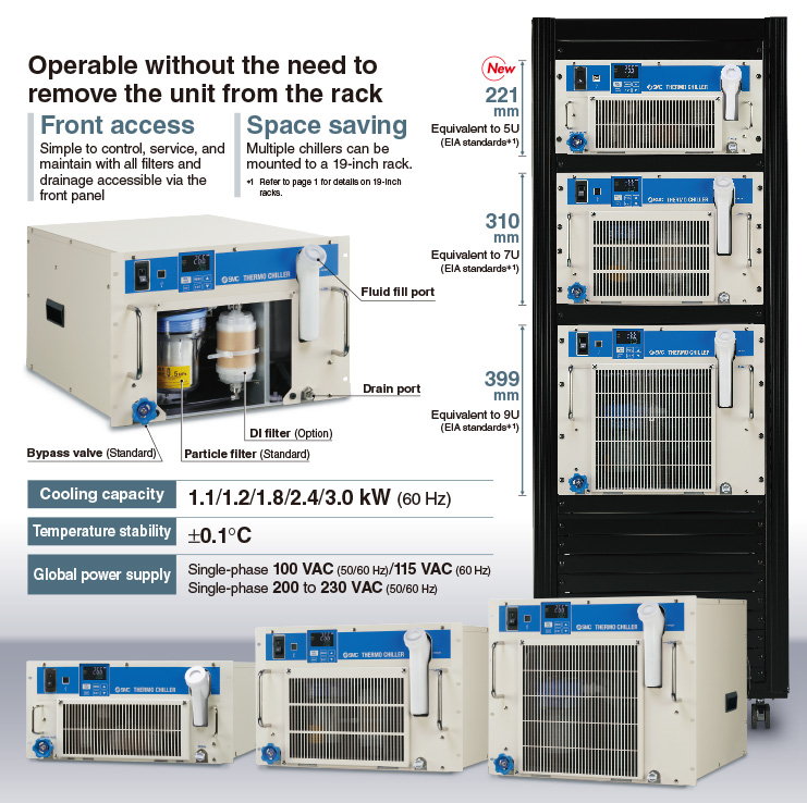 ・Front access: Simple to control, service, and maintain with all filters and drainage accessible via the front panel ・Space saving: Multiple chillers can be mounted to a 19-inch rack. ・Cooling capacity: 1.1/1.2/1.8/2.4/3.0 kW (60 Hz) ・Temperature stability: ±0.1℃ ・Global power supply: Single-phase 100 VAC (50/60 Hz)/115 VAC (60 Hz) Single-phase 200 to 230 VAC (50/60 Hz) |