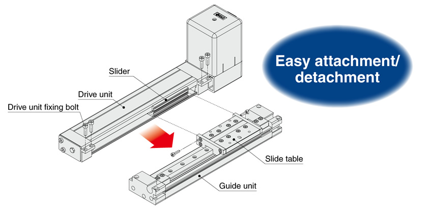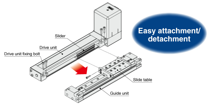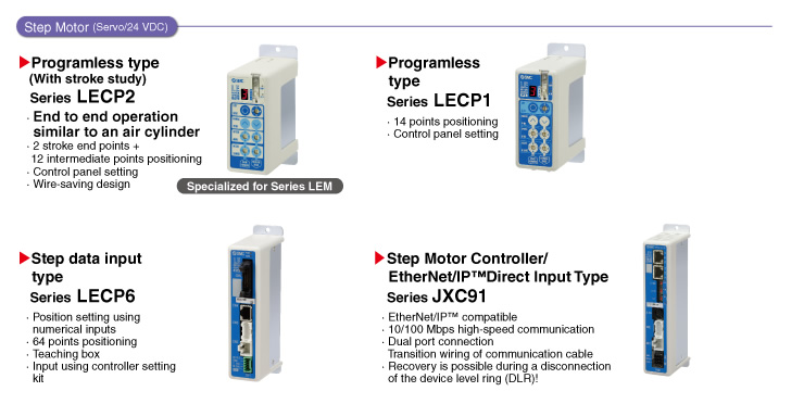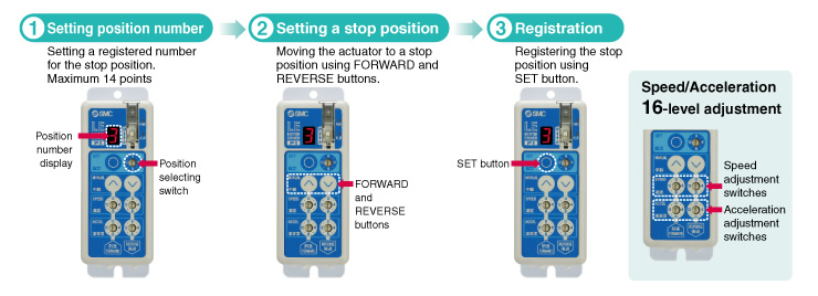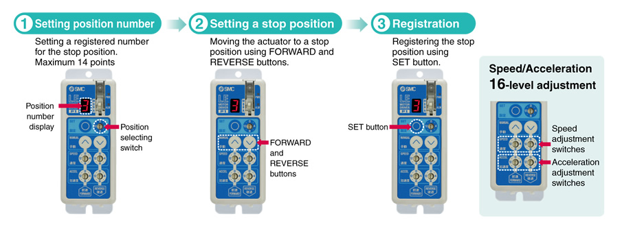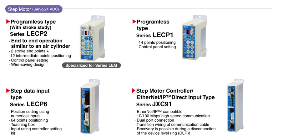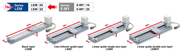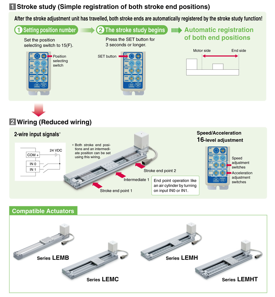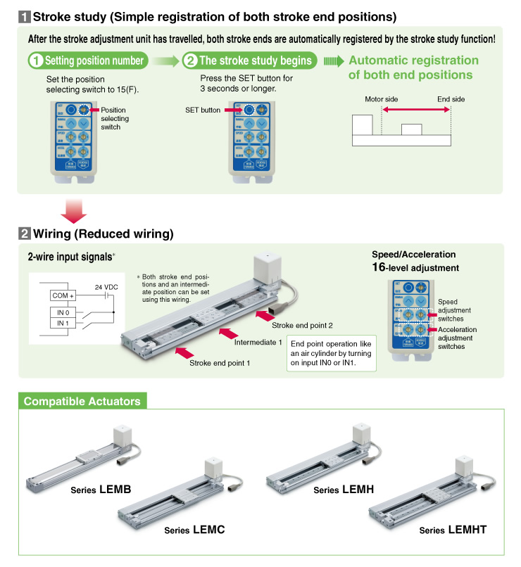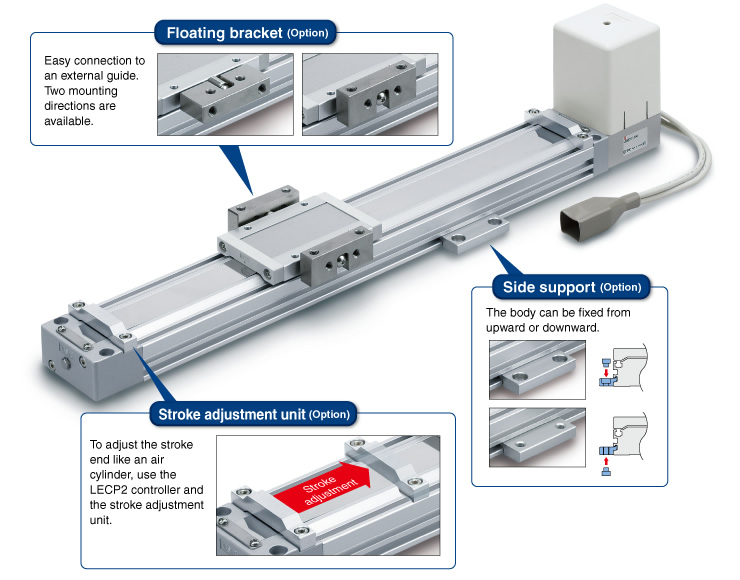 (In the case of LEMC/H/HT, size 25) ・Can be combined with various guides ・High maintainability ・Motor mounting position: Select from above or below, right or left ・Solid state auto switches can be mounted for limit confirmation and intermediate signal confirmation. ・Selectable controllability (Controller) Complete control like an air cylinder (Allows for a 12 point intermediate stop) Easy position setting by value input |