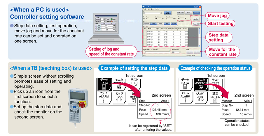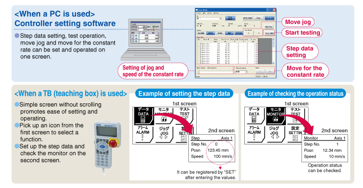 - JOG and constant rate movement, return to origin, test operation and testing of forced output can be performed.