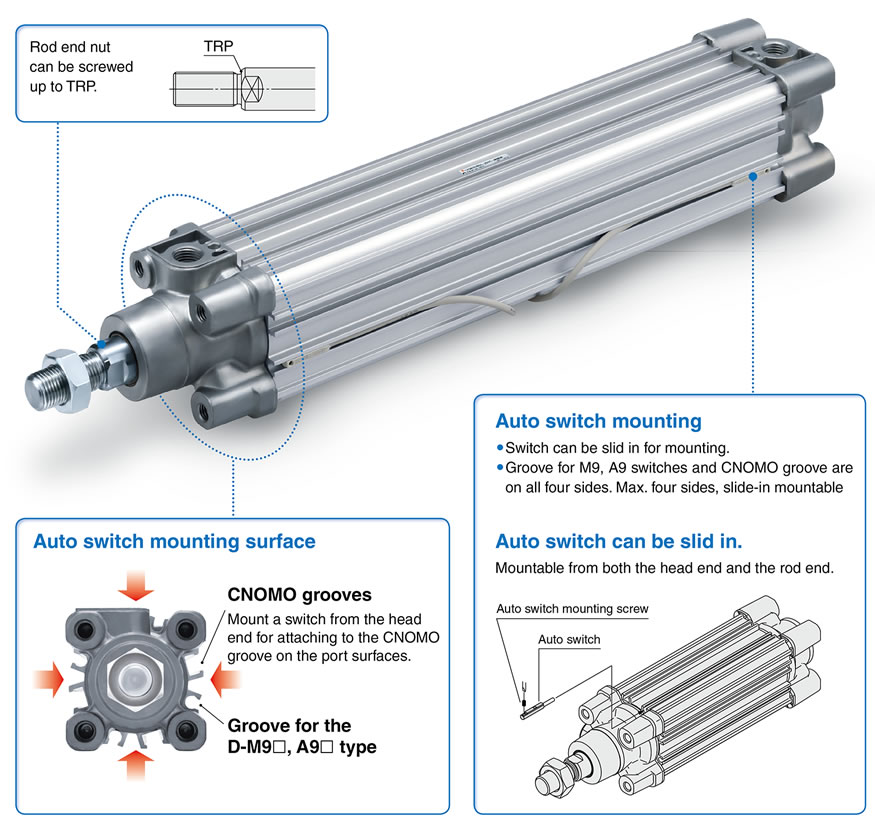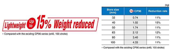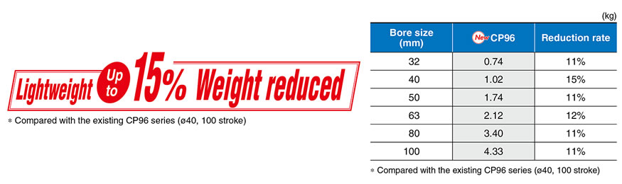 ・Cushion valve can easily be adjusted. ・CNOMO, D-M9□, and A9□ grooves located on 4 surfaces ・With auto switch (CP96SD series: CP96SD, CP96KD) ∗ The CP96 series (ø32 to ø100) has been remodeled. Please select the new CP96 series. |
