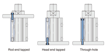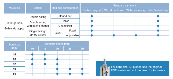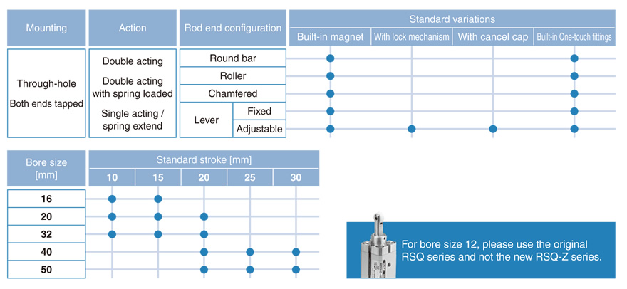 | Fixed mounting height | RSQ | Double acting Double acting with spring Single acting, spring extend |