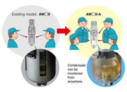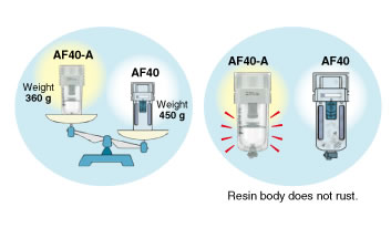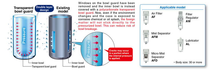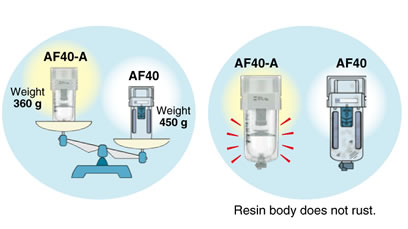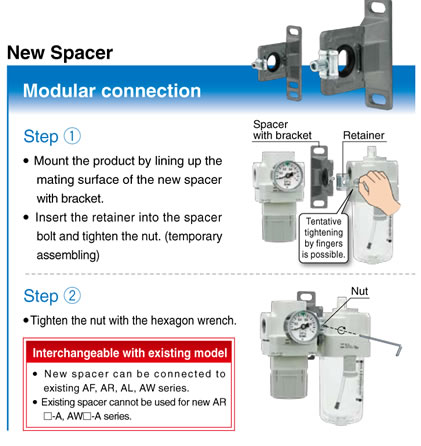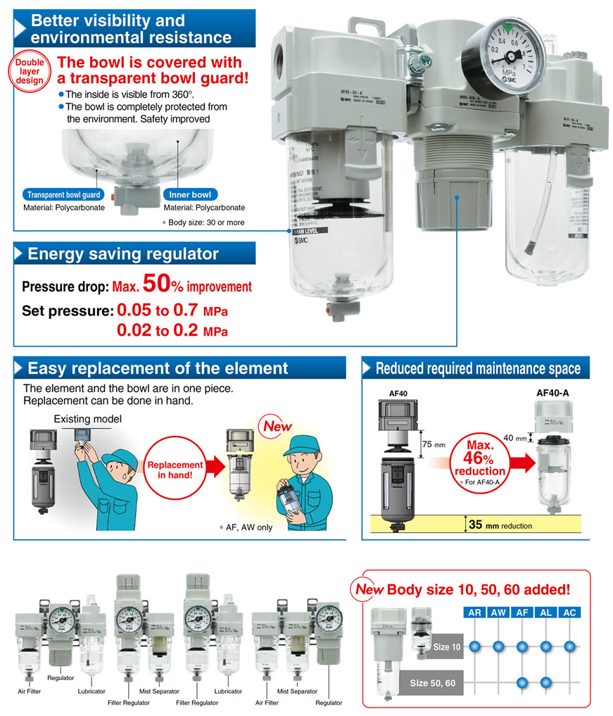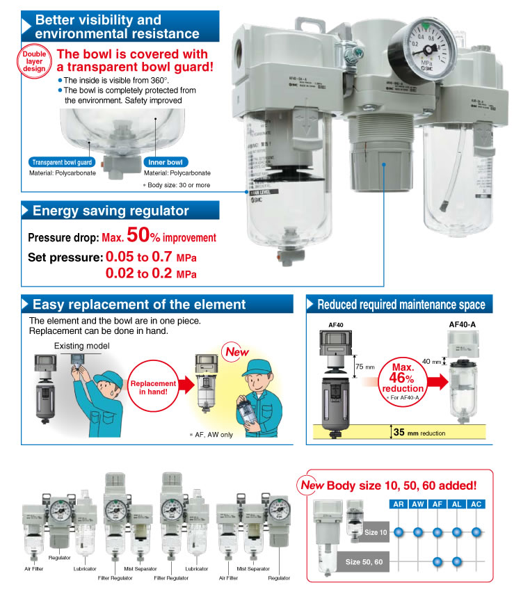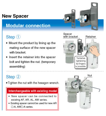 The element and the bowl are integrated. Replacement can be done in hand. ・Energy-saving regulator Pressure drop: Max. 50% improvement ・Reduced required maintenance space: Max. 46% reduction ・Better visibility & increased safety The bowl is covered with a transparent bowl guard. ・ Attachments: Spacer: Y200-A, Y300-A, Y400-A, Y500-A Spacer with bracket: Y200T-A, Y300T-A, Y400T-A, Y500T-A |