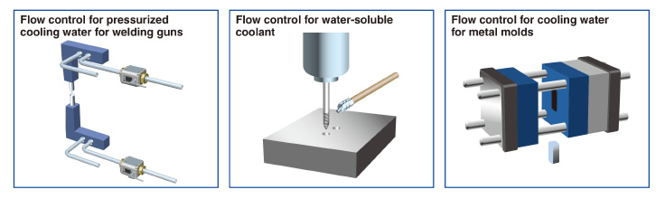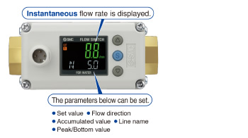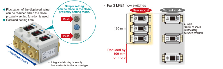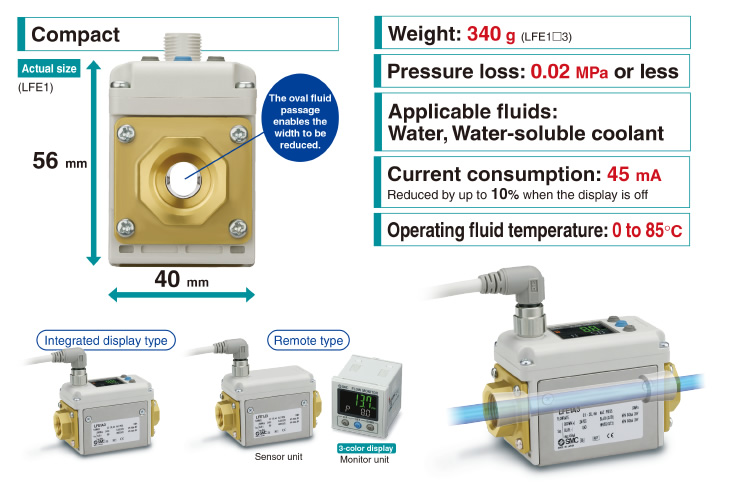 ・Compact and lightweight 56 mm x 40 mm x 90 mm (H x W x D) Weight: 340 g (In the case of LFE1□3) ・Pressure loss: 0.02 MPa or less ・Close proximity setting allows for space saving. ・Backflow can be detected ・Fluid temperature: 0 to 85℃ ・Current consumption: 45 mA |