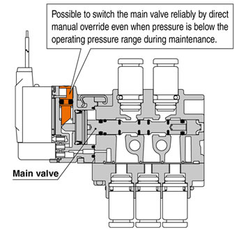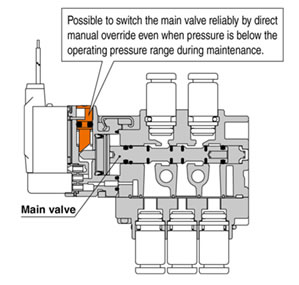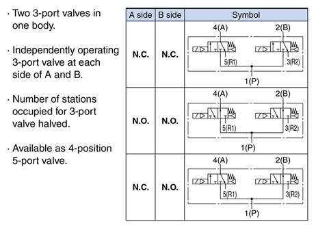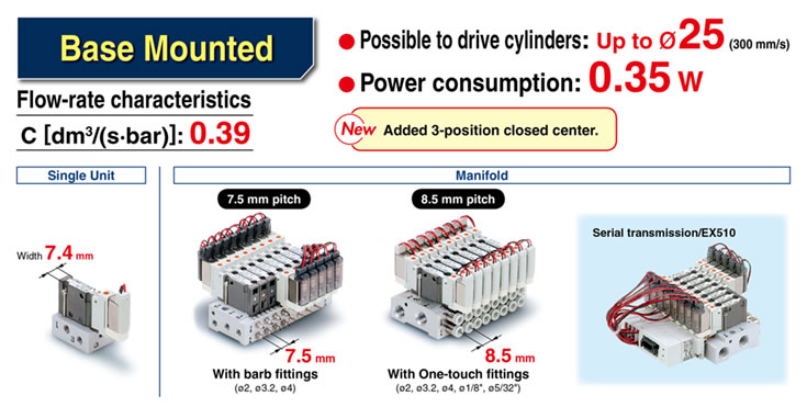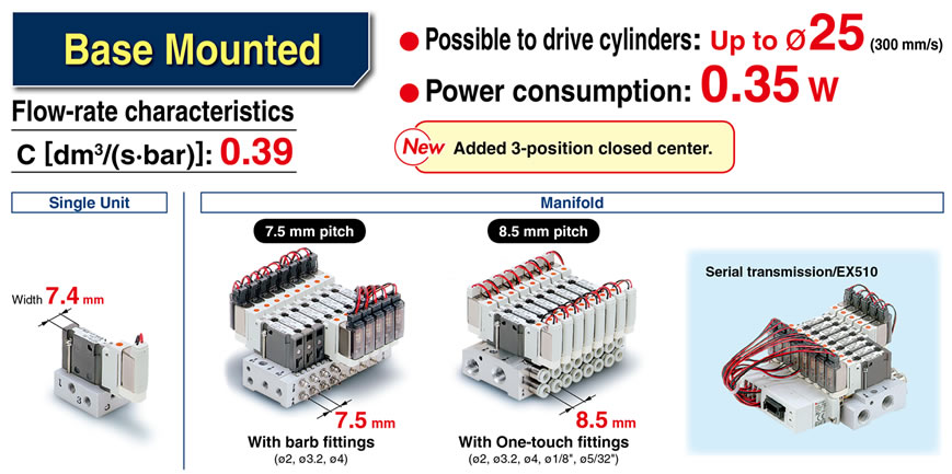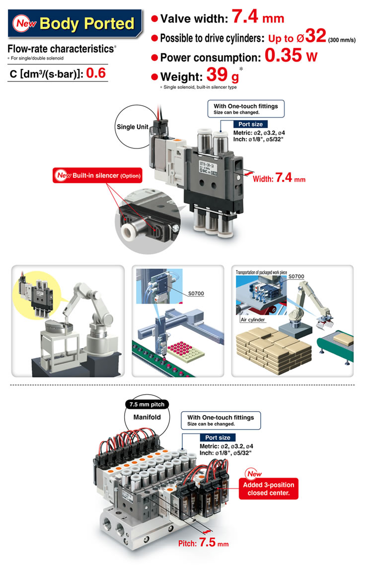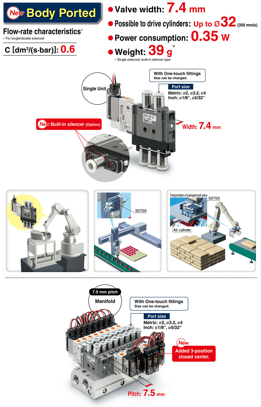 ・Possible to drive cylinders: Up to φ32 (Body ported) ・Power consumption: 0.35 W ・Weight: 39 g (Body ported) ・Manifold pitch: SS0752, SS0755 |