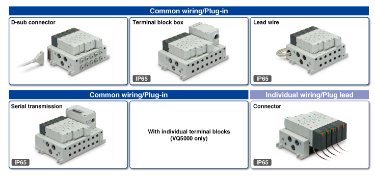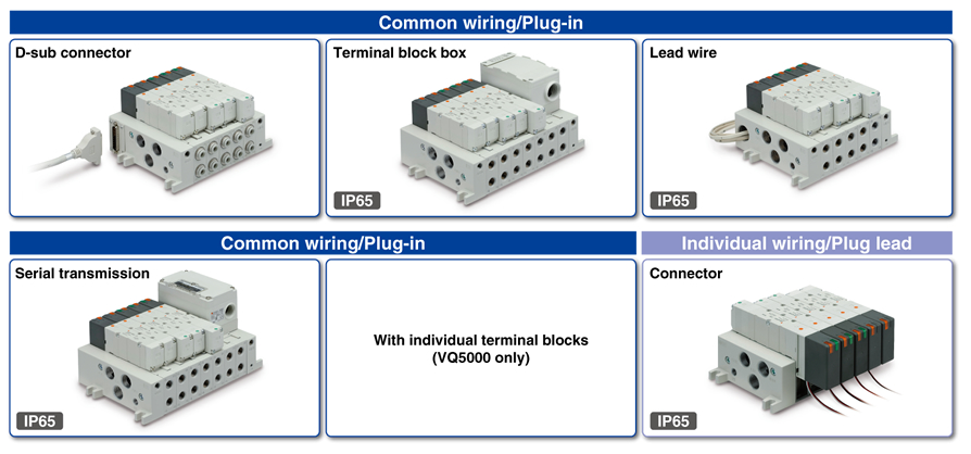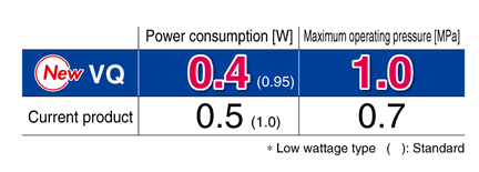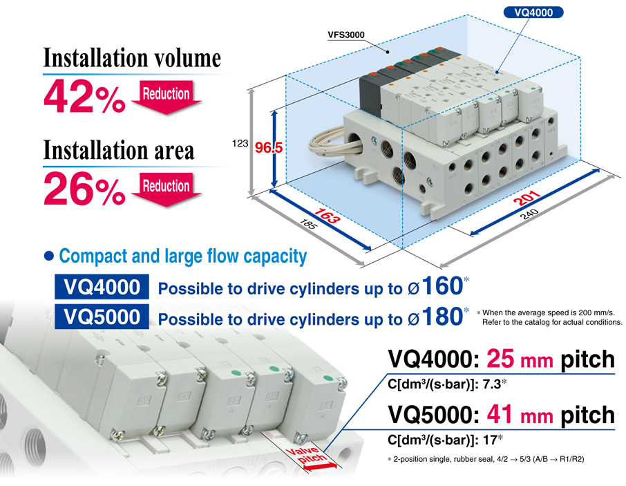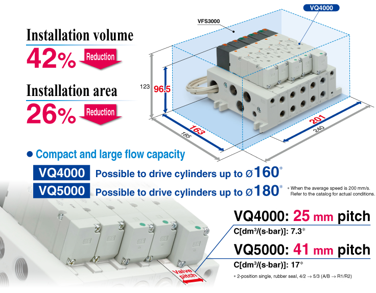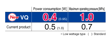 Installation volume: 42% reduction, Installation area: 26% reduction VQ4000: Can drive cylinders up to ø160 VQ5000: Can drive cylinders up to ø180 ・Power saving: Power consumption of 0.4 W (Low wattage type) ・Long service life: 100 million cycles (According to SMC life test conditions) |