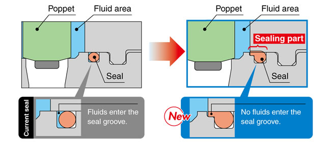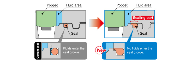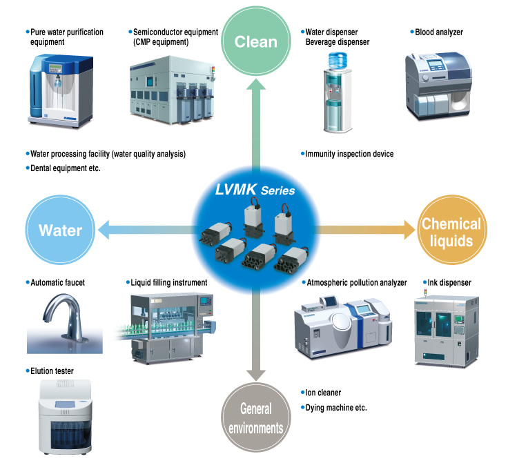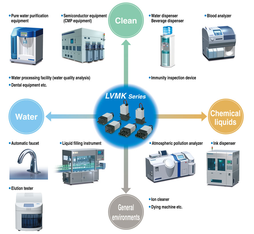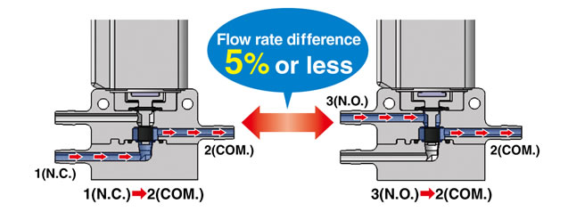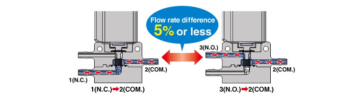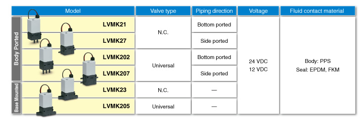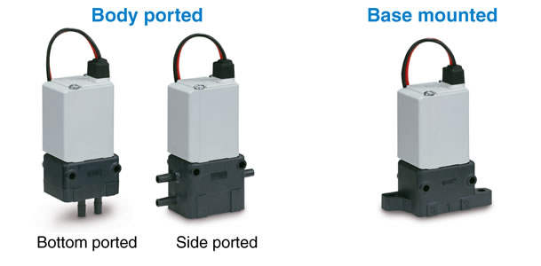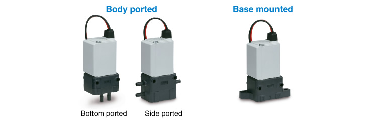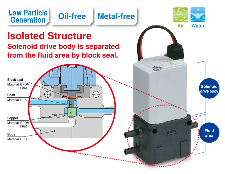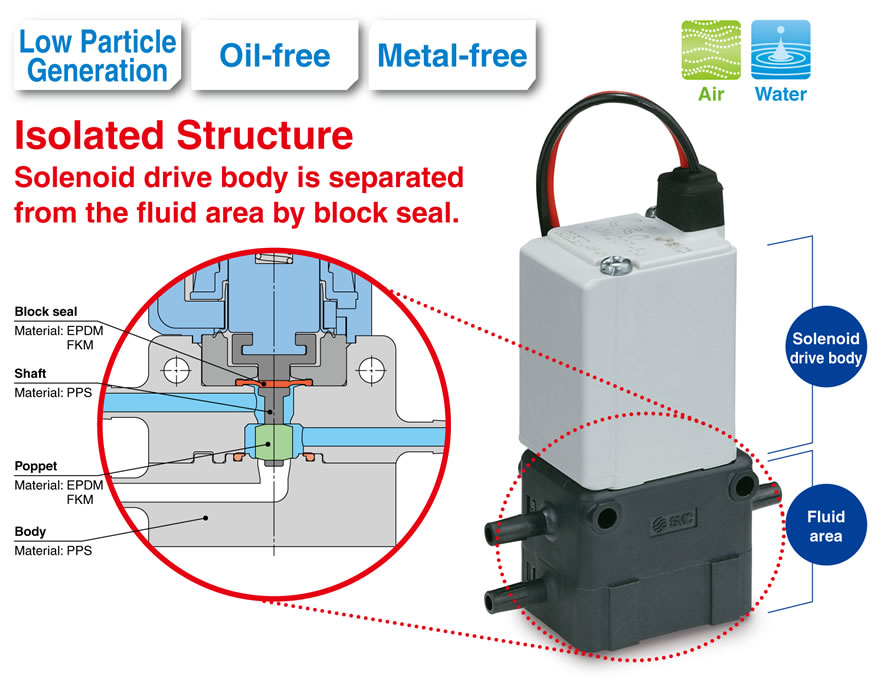・Fluids: Air, Water, Deionized water, Diluent, Cleaning fluid ・Isolated structure: The solenoid drive body is separated from the fluid area by a block seal. ・Easy piping ・Minimal dead space ・Flow adjustment is not required. |