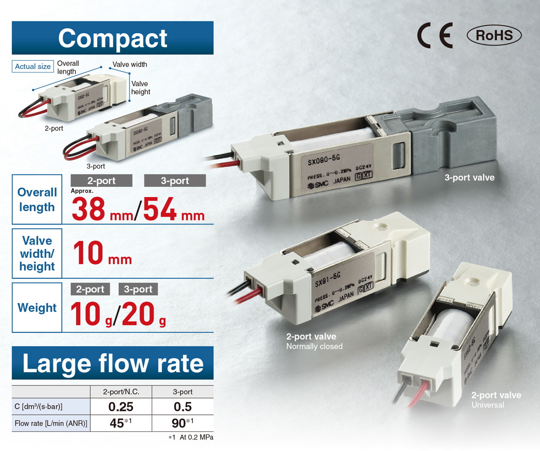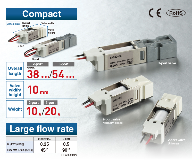 Overall length: apporox 38 mm (2-port), 54 mm (3-port) Valve width/ height: 10 mm Weight: 10 g (2-port), 20 g (3-port) ・Large flow rate C [dm3 (/ s·bar)]: 0.25 (2-port/N.C.) , 0.5 (3-port) Flow rate [L/min (ANR)]: 45* (2-port), 90* (3-port) *At 0.2 MPa |